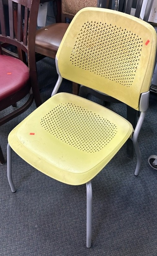 Used Indoor/Outdoor chair with yellow seat and metal legs. We have tons of used furniture, in various quantities. We constantly have new inventory coming in, so contact us to see whats in stock. Please reach out for more information or come see this product and what else we have to offer in-store today.